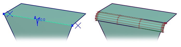 将构建圆角曲面,以便对输入曲面进行修剪。为实现此目的,将延伸圆角曲面,并在某些情况下插入其他等参线。