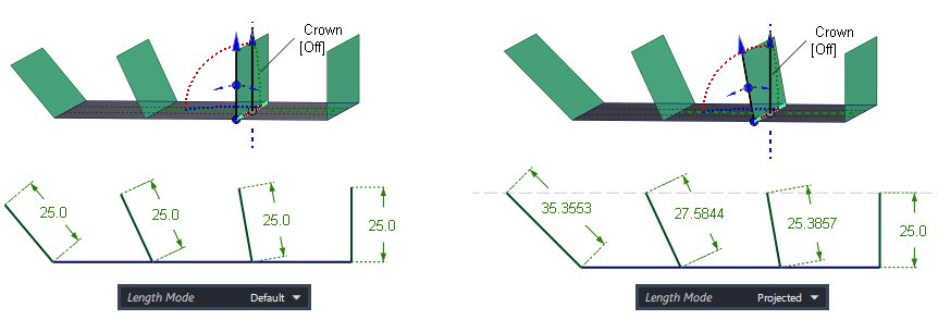 Projected -“Length”值用于计算与输入曲线的偏移距离,并按照此距离构建凸缘。如果拔模角度为零,则默认值和投影值将相同。如果应用了角度,则凸缘的实际长度将不同于指定的“Length”值。
