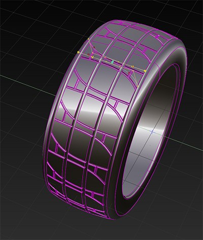 DP-Nurbs-Tire - 现在,您可以使用自定义曲线为轮胎生成胎面图案。在“Tread parameters”中,将“Create”设置为“Custom”,然后使用“Custom Tread”参数进行调整。确保要用于胎面图案的自定义曲线位于轮胎几何体的近处和上方。