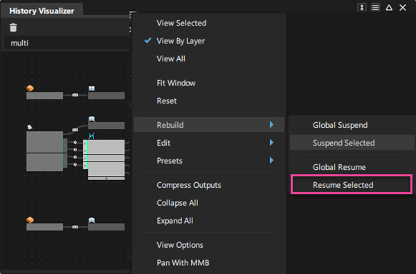 “Resume Selected”可用于在单个选定节点上恢复挂起的历史记录。这样,您就不再需要恢复图形中所有节点上的历史记录。