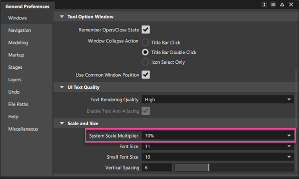 在“General Preferences”的“Windows”>“Scale and Size”部分中访问“System Scale Multiplier”首选项。