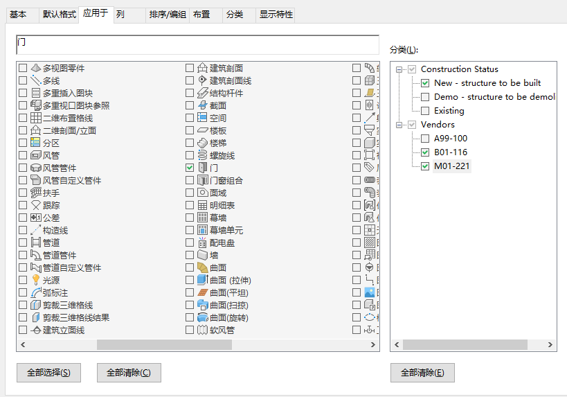 例如,如果仅希望为构造分类为“新建”、供应商带有首选分类的门编制明细表,可以在明细表样式中指定这些标准。只有符合这两个标准的门才会包含在明细表中。
