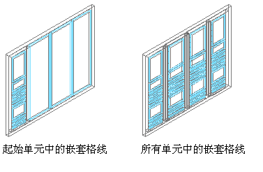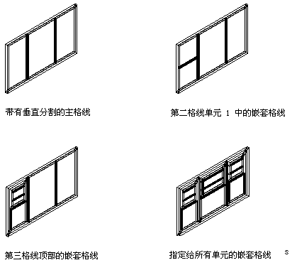 可以继续嵌套格线,以创建多个级别。例如,下面的插图显示了“标准”门窗组合样式格线、同一格线在其二级格线的一个单元内嵌套一条格线的图形、以及同一格线在其二级格线的所有单元内都嵌套格线的图形。