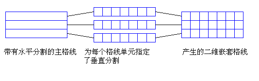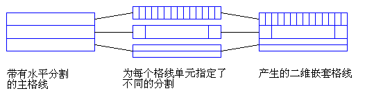 上图显示了格线中具有同一单元指定(即垂直分割)的所有单元。但格线中的每个单元都是独立的,且可以带有不同的指定。例如,下面的插图显示了主要格线中的一个单元包含另一水平格线,而下一个单元包含带有三个分割的垂直格线,再下一个单元包含带有六个分割的垂直格线。