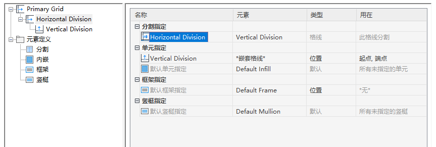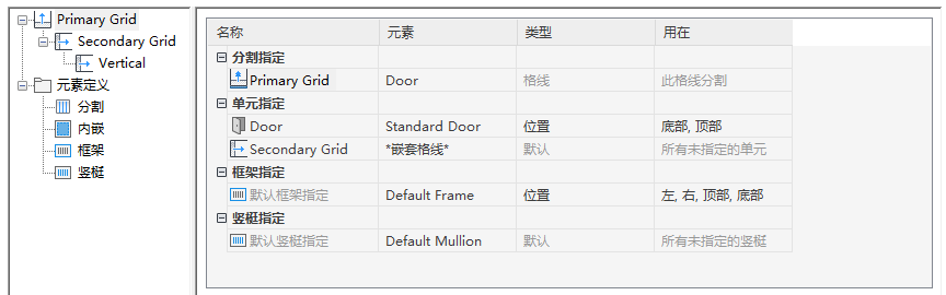 可以在“门窗组合样式特性”对话框的“设计规则”选项卡中定义嵌套格线。选项卡左侧的树列出格线,其中通常包括一条主要格线。主要格线可以有一条或多条二级格线。每条二级格线可以有一条或多条三级格线,以此类推。