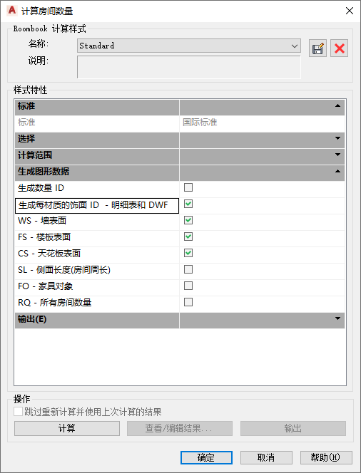 - 在“计算房间土方量”对话框中,在“样式特性”下的“生成图形数据”列表中,选择“生成每材质的完工 ID”。