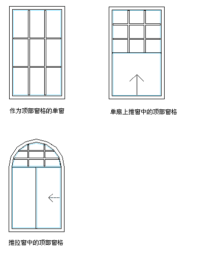 | 仅顶部窗扇 | 在“窗格”下,选择“顶部”。“顶部”对于单个窗扇也适用。 |