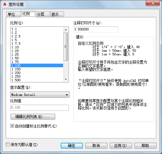 | 保存比例设置,将其用作从头开始创建的新图形或基于不包含图形设置信息的样板创建的图形的默认设置 | 选择“另存为默认值”。“单位”和“分层”选项卡上的设置也保存为默认设置。 |