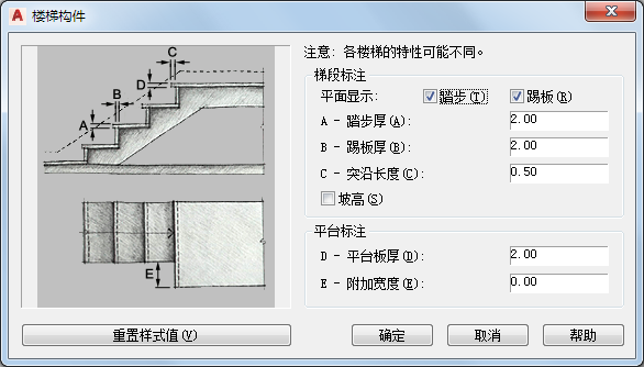 在“梯段标注”下,选中或清除踏步与踢板的平面显示。