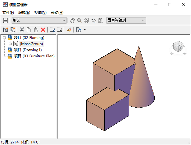 “模型管理器”的右窗格显示在左窗格中选择的体量元素或体量编组的图形视图。