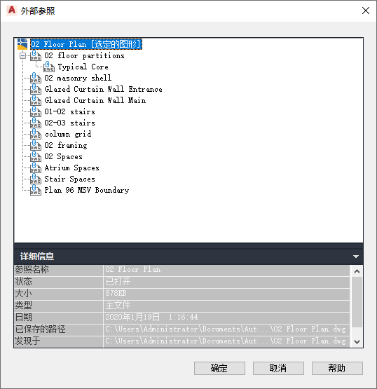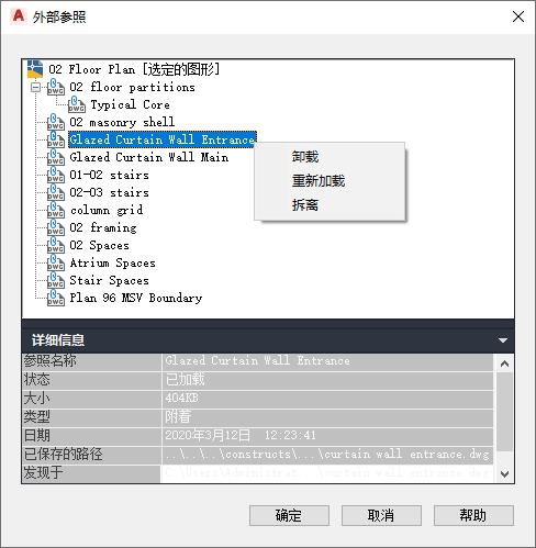 - 在“外部参照”对话框中,查看外部参照的详细信息: