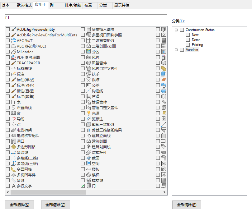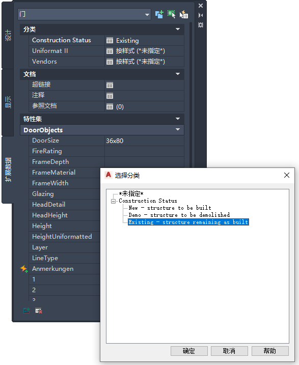 分类定义列出在对象样式特性的“分类”选项卡上。在对象样式中选择分类(如“新建”)。例如,您的图形可能包含现有门的某些门样式和新构造的其他样式。使用这些样式创建的所有门在其样式中都已指定分类。