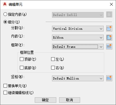 | 细分单元后,为创建的格线选择竖梃定义 | 选择竖梃定义。 |