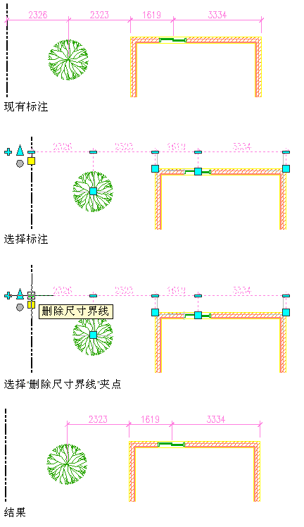 2. 在要删除的每个点的尺寸界线上单击“删除”夹点 (),或者 依次单击“AEC 标注”选项卡 “修改”面板 “删除尺寸界限”