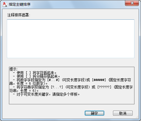 使用此过程可指定在注释记号编辑器、“选择注释记号”对话框或注释记号图例中显示给定数据库中的注释记号时,这些注释记号的排列顺序。若要指定排序顺序,请输入一个或多个遮罩,分别对应于数据库中注释所用的模式。在每个模式中,注释记号是在字段的基础上排序的。换而言之,其注释模式与输入的第一个遮罩相同的所有注释记号,将排列在使用所输入的第二个模式的所有注释记号之前。