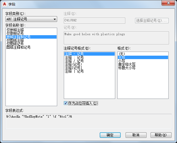在“字段”对话框中,确认“字段”类别是“AEC 注释记号”。