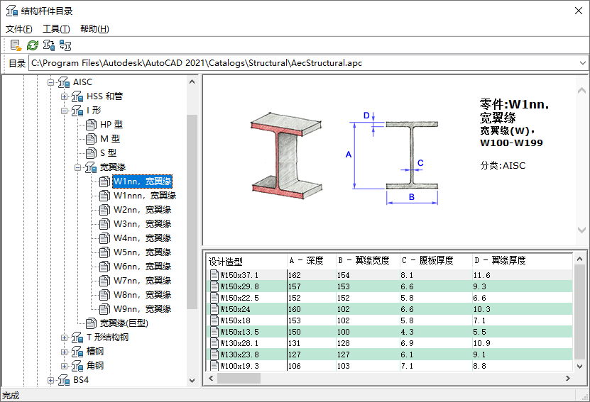 要为大部分标准梁、支撑和柱创建样式,可以使用 AutoCAD Architecture 2025 toolset中提供的“结构杆件目录”。该目录包含以类似“文件资源管理器”树状视图组织的行业标准混凝土、钢材和木材结构造型的规范。可以浏览目录、选择造型,然后创建样式。