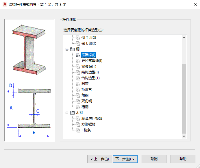 如果已知要创建的杆件的类型、造型以及造型尺寸,即可以迅速地在“结构杆件样式”向导中输入信息来创建样式。可以在基于该目录中任意杆件造型的样式中创建结构杆件造型。
