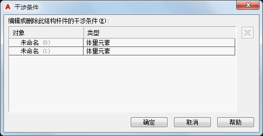 注: 您还可以使用该工作表删除干涉条件,方法是在其“对象”或“类型”值上单击鼠标右键,然后单击“删除”。或者,可以使用结构杆件的关联菜单来删除干涉条件。删除干涉条件时,会删除结构杆件之间的关联以及用于创建干涉条件的对象。对象本身不会从图形中删除。
