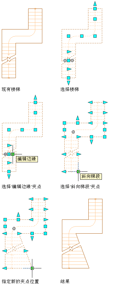 选择楼梯梯段上的“斜向梯段”夹点,然后将夹点从楼梯走向移至新位置。