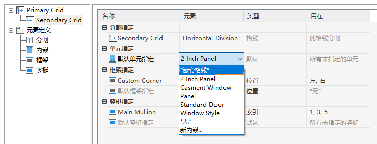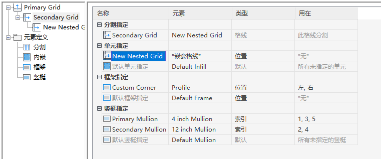 执行以下步骤可以创建嵌套格线,即格线内的格线。每条嵌套格线都有其自己的分割规则、单元指定、框架与竖梃。默认情况下,嵌套格线的框架将关闭。