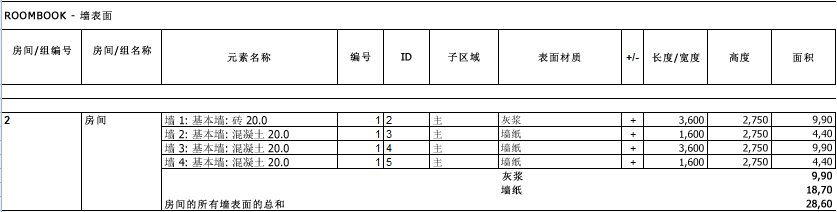 墙表面列中有关每房间的和全部的窗口面积的信息都可以在 Excel 文件中的“所有房间土方量的测量”选项卡中找到。