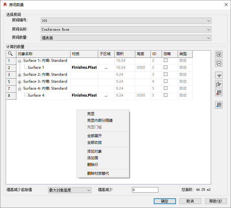 解决方法:要在这种情况下确保对天花板表面正确计算,请使用对话框中的天花板系数 (%) 参数“计算房间土方量”。如果默认天花板系数为 50%,将遵循以下规则: