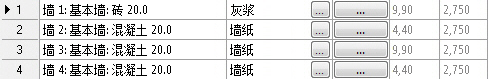 下图所示的 2x4 m 楼层平面(由一个砖墙和三个混凝土墙组成)使用以下墙轴来计算墙表面: