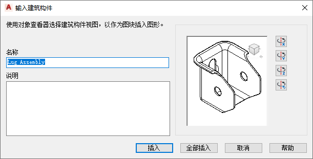 - 使用“旋转”按钮,在将模型插入到图形中时,围绕 X、Y 或 Z 轴旋转模型。