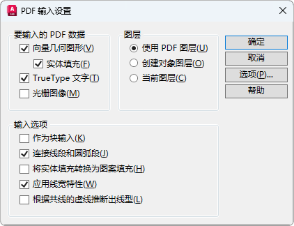 设置相关选项,以便从指定的 PDF 文件输入几何图形、填充、光栅图像和 TrueType 文字对象。