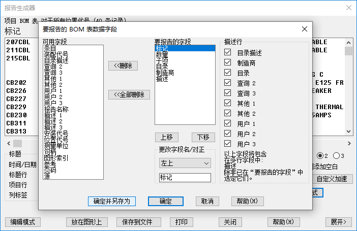 - 在“要报告的 BOM 表数据字段”中,进行必要的更改(如果有)。单击“确定并另存为”。