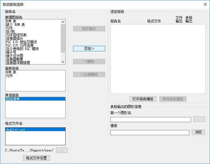 - 在“自动报告选择”对话框的“其他报告”下,单击“图纸清单”,然后选择 .set 文件。