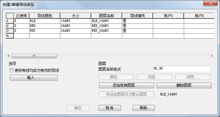 若要创建导线图层,请在空白行中输入导线颜色和尺寸。将输入默认图层名称,您可以根据需要进行重命名。在执行线号操作时,线号将添加到除定义为“无导线编号”的图层以外的所有图层中。该选项对于诸如单线图形等某些情况非常有用。使用颜色、线型和线宽定义图层特性。