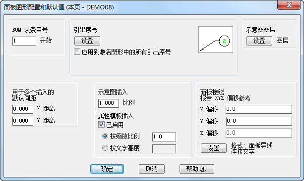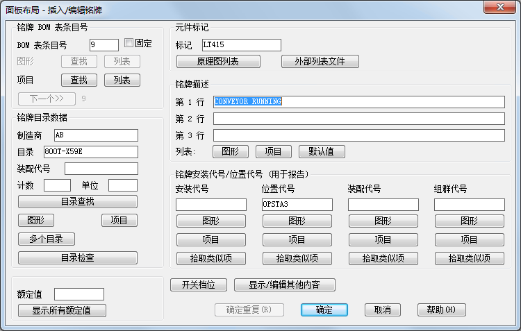 插入铭牌时,您可将其关联到面板示意图。将复制示意图中的值,例如标记、安装代号、位置代号和描述。但是,您可以指定铭牌特定的 BOM 表条目号和目录值。