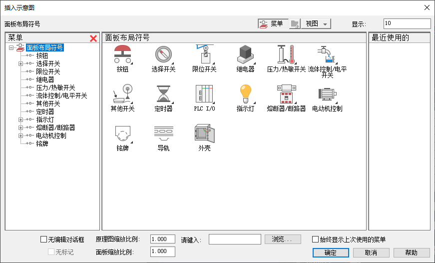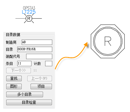 从图标菜单插入示意图时,可以选择目录值,并插入与该值相关联的示意图。如果没有与该目录关联的面板符号,您可以浏览到某个符号,或即时绘制一个符号。