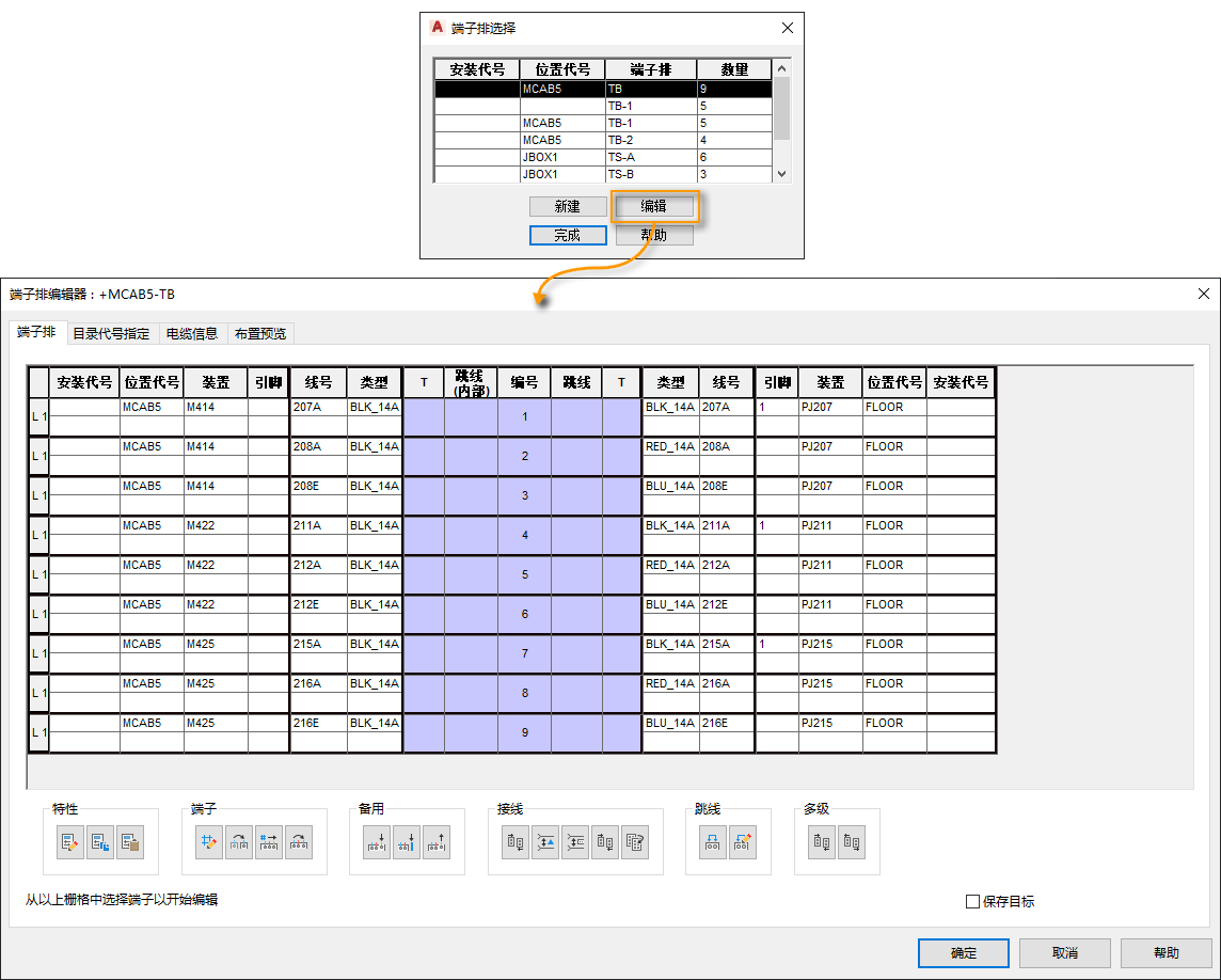 该编辑器包含有关目录值、连接的元件、连接的导线、线号等内容的信息。