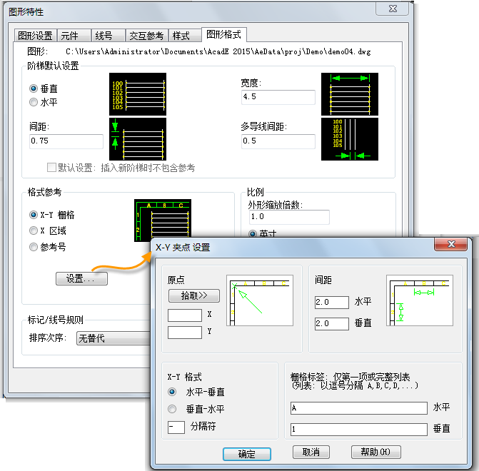 定义参考系统格式后,可以在图形中插入阶梯、X-Y 栅格或 X 区域。在“原理图”选项卡