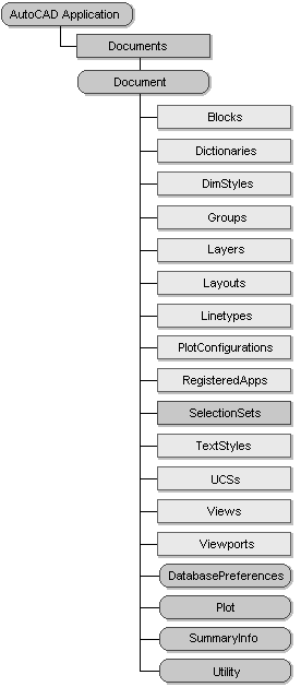 Access to the graphical objects (lines, circles, arcs, and so forth) is provided through the ModelSpace and PaperSpace collections, and access to nongraphical objects (layers, linetypes, text styles, and so forth) is provided through like-named collections such as Layers, Linetypes, and TextStyles. The Document object also provides access to the Plot and Utility objects.