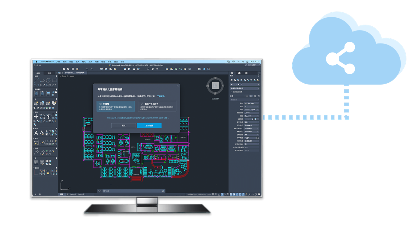 共享指向当前图形副本的链接,以在 AutoCAD Web 应用程序中查看或编辑。包括所有相关的 DWG 外部参照和图像。