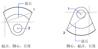 起点和圆心之间的距离确定半径。圆弧的另一端通过指定圆弧的起点与端点之间的弦长来确定。