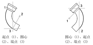 起点和圆心之间的距离确定半径。端点由从圆心引出的通过第三点的直线决定。