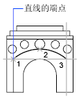 可以通过指定三点绘制圆弧。在下面的示例中,圆弧的起点捕捉到直线的端点。在该示例中,圆弧的第二点捕捉到中间的圆。