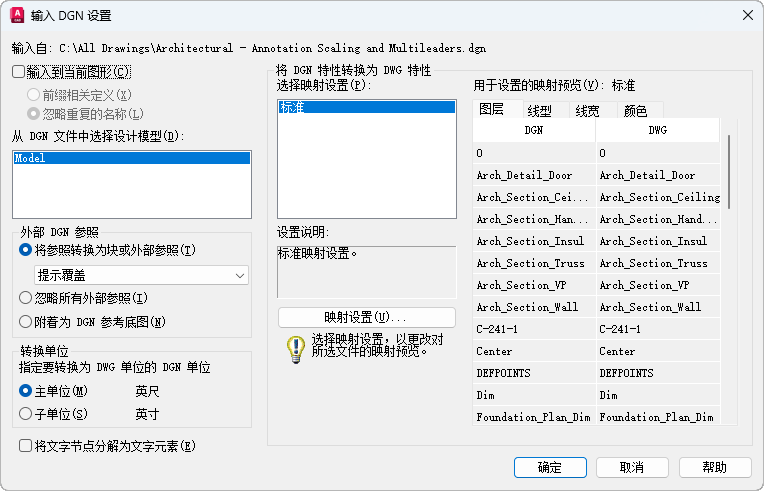 打开“DGN 映射设置”对话框,从中可以创建新映射设置以及重命名、修改或删除现有映射设置 (DGNMAPPING)。