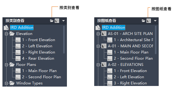 在“图纸列表”选项卡上,可以将图纸整理为集合,这些集合被称作子集。在“图纸视图”选项卡上,可以将视图整理为集合,这些集合被称作类别。