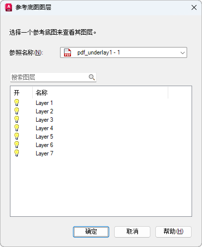 使用 DWFLAYERS、PDFLAYERS、DGNLAYERS 或 ULAYERS 命令,或在选定的参考底图上单击鼠标右键,然后单击快捷菜单中的“图层”。