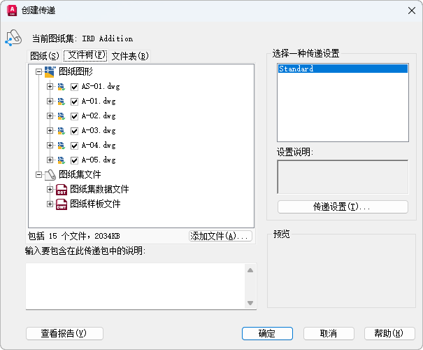 默认情况下,将列出与当前图形相关的所有文件(例如相关的外部参照、打印样式和字体)。用户可以向传递包中添加文件或从中删除现有文件。传递包不包含由 URL 引用的相关文件。