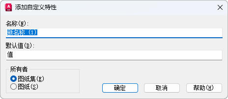 SHEETSET(命令) 查找:“打开图纸集” > 在顶部节点上单击鼠标右键 > “特性” > “编辑自定义特性” > “添加”