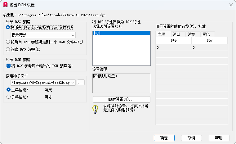 “标准”是默认的映射设置,使用该设置,可以从要输出的图形中提取数据并将自动映射应用到 DGN 图层、线型、线宽和颜色(如映射预览中所示)。