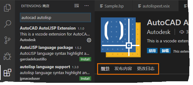 注: 在安装 AutoCAD AutoLISP 扩展之前,请禁用支持 LSP 文件的任何其他 VS Code 扩展。