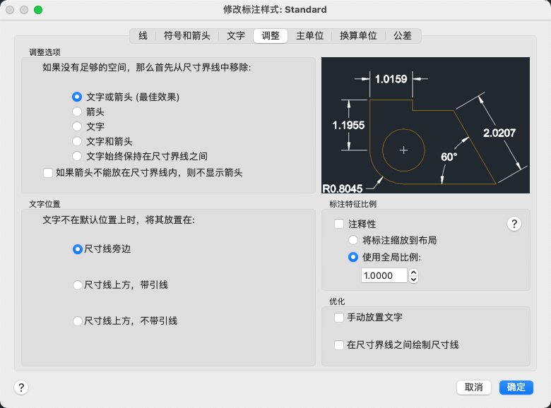 控制基于尺寸界线之间可用空间的文字和箭头的位置。